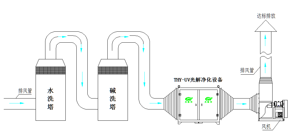 化工廢氣處理考慮運營(yíng)成本及安全性,本方案(àn)工藝路線擬定采用“通風係統(風機、收集罩、管道)+預處理係統(水噴淋塔+堿洗塔)+核(hé)心淨化係統(UV光解淨化設備)”來進行化工廢氣處理。工藝設備圖如下: